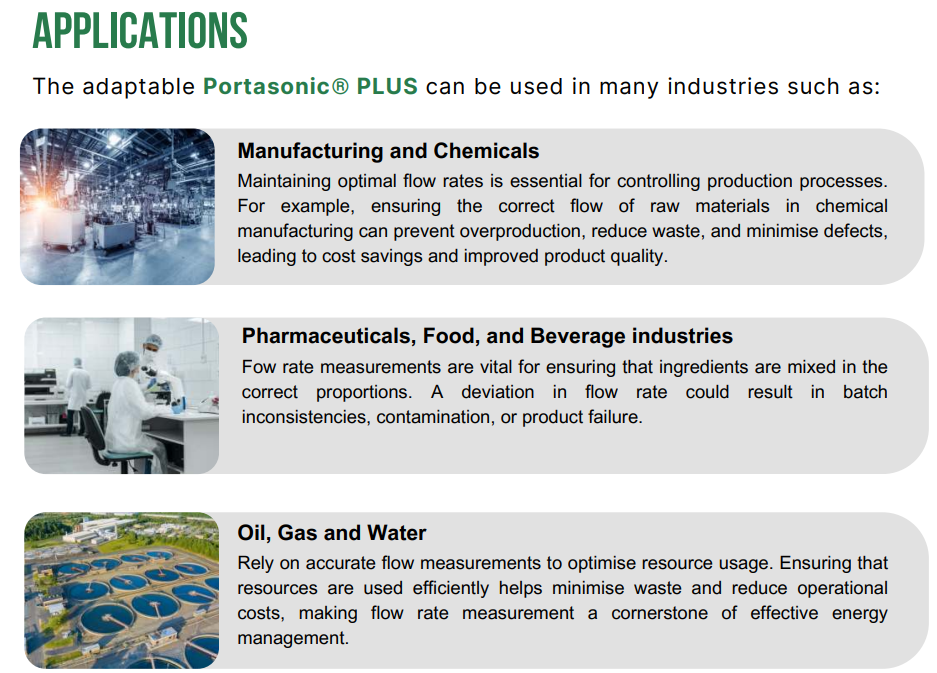 Thiết bị Portasonic® PLUS được sử dụng để đo lưu lượng của hầu hết các chất lỏng sạch với hàm lượng chất khí / rắn nhỏ hơn 10% thể tích trong đường ống.
