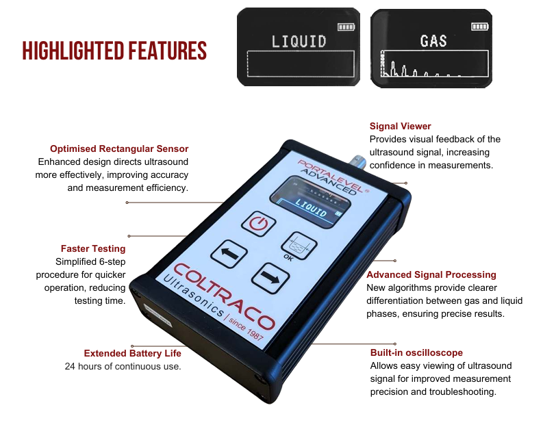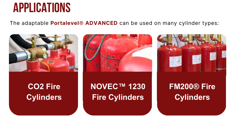 Thiết bị Portalevel® ADVANCED xác định nhanh chóng và chính xác mức chất lỏng của nhiều loại chất chữa cháy hóa lỏng chứa bên trong bình chữa cháy, bao gồm CO2, FM200™ và NOVEC™1230. Thiết bị được trang bị màn hình OLED độ tương phản cao, hiển thị rõ ràng pha của chất lỏng trong bình chứa, hiển thị cả trạng thái "GAS" (KHÍ) và "LIQUID" (LỎNG).