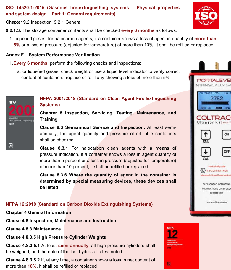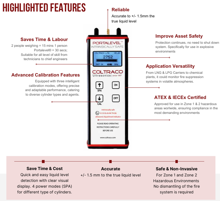 Việc theo dõi mức chất lỏng trong bình chữa cháy là một khía cạnh quan trọng trong bất kỳ kế hoạch bảo dưỡng hệ thống chữa cháy nào, tuy nhiên, việc hiểu rõ mối liên hệ giữa mức chất lỏng và trọng lượng nạp của bình cũng quan trọng không kém. Coltraco Ultrasonics cung cấp sản phẩm Portalevel® dùng kết hợp với các thiết bị đo mức, giúp tính chuyển đổi từ mức chất lỏng sang khối lượng của chất chữa cháy còn lại trong bình.