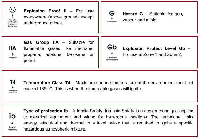Chứng nhận ATEX: II 2 G Ex ib IIA T4 Gb
