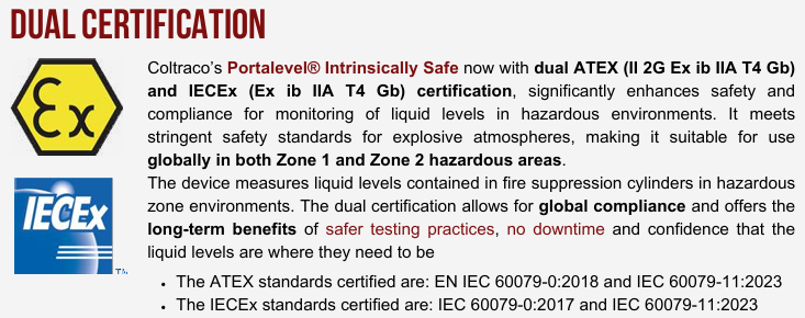 Được phê duyệt sử dụng trong Khu vực 1 và Khu vực 2, đạt chứng nhận ATEX II 2 G Ex ib IIA T4 Gb và IECEx (Ex ib IIA T4 Gb), thiết bị Portalevel® INTRINSICALLY SAFE có thể được sử dụng ngay cả trong những môi trường nhạy cảm nhất.