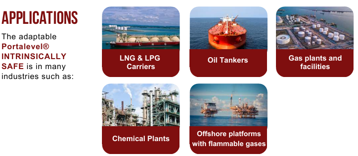 Được thiết kế chú trọng đến an toàn, Portalevel® INTRINSICALLY SAFE đặc biệt thích hợp dùng cho các khu vực có khả năng tồn tại khí, hơi dễ bay hơi hoặc dễ nổ trong không khí (IECEx Zone 1), chẳng hạn như: