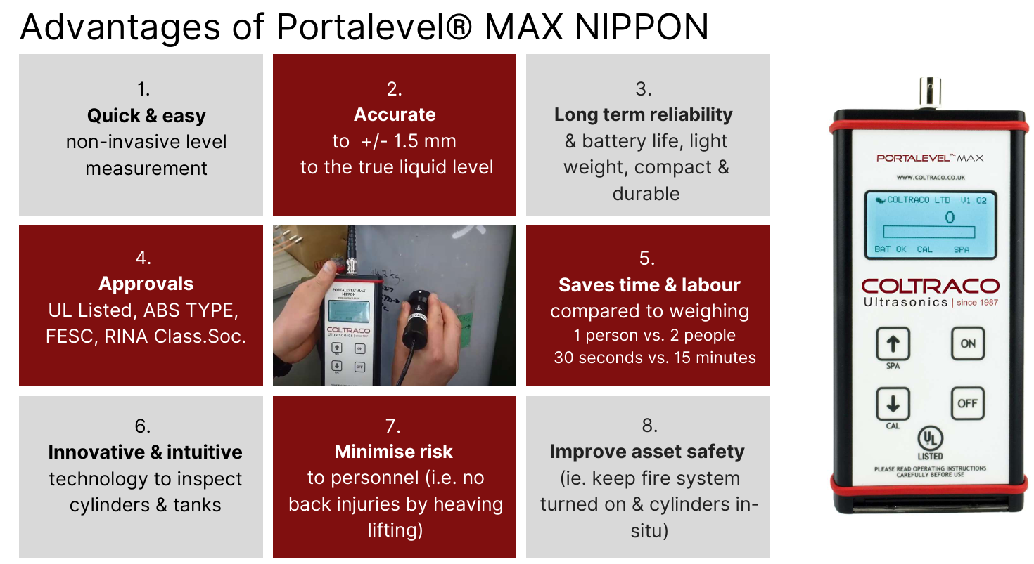 Được sự chấp thuận của Trung tâm Thiết bị và An toàn Phòng cháy Chữa cháy Nhật Bản (FESC), thiết bị Portalevel® MAX NIPPON là giải pháp được thiết kế riêng để xác định mức chất lỏng trong bình chữa cháy, được chế tạo theo các yêu cầu quy định của Nhật Bản. Đây là một nền tảng đo lường có độ chính xác cao và linh hoạt, hoạt động vượt trội trong cả môi trường biển và đất liền với khả năng trả về các phép đo đáng tin cậy và chính xác. Máy tính Portalevel® MAX NIPPON có thể được sử dụng cùng với Portalevel® MAX NIPPON để tính toán chính xác trọng lượng chất chữa cháy của hệ thống chữa cháy và đảm bảo hoạt động an toàn của hệ thống. Độ chính xác vượt trội của Portalevel® MAX NIPPON sánh ngang bằng với tính năng dễ sử dụng:
