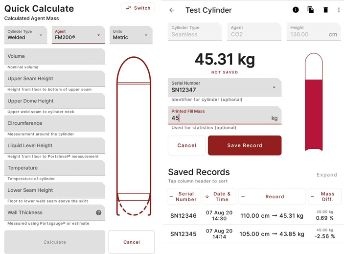 1. Nhập thông tin chi tiết về bình chữa cháy như: chất chữa cháy, chiều cao, chu vi, mức chất lỏng (đo từ thiết bị Portalevel MAX), nhiệt độ, chiều cao vòm bình, khối lượng được nạp trên nhãn in...