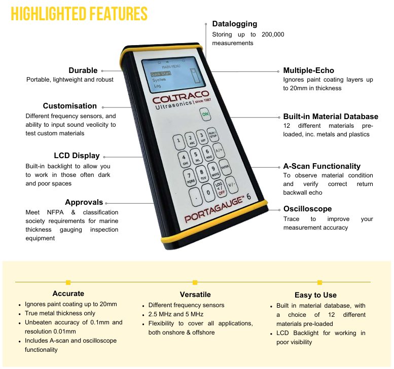 Thiết bị đo độ dày siêu âm đa xung Portagauge® 6 là thiết bị đo độ dày có độ chính xác và độ tin cậy cao, dùng để đo độ dày của nhiều loại kim loại và nhựa cứng, được phát triển để đáp ứng tiêu chuẩn BS EN 15317:2013, tiêu chuẩn về kiểm tra, phân tích và xác minh siêu âm cho thiết bị đo độ dày.