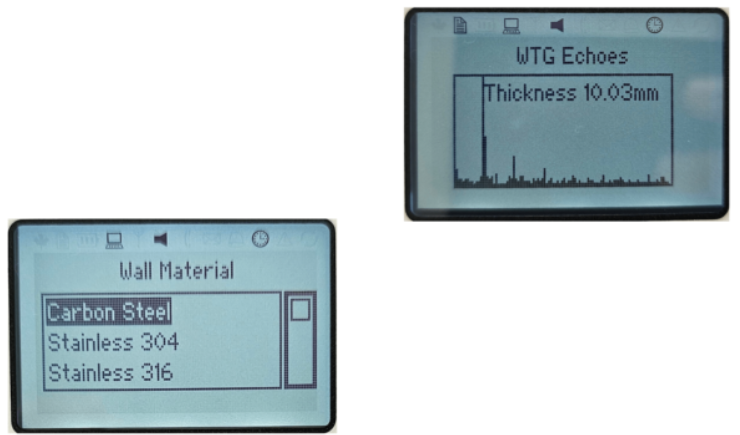 Loại vật liệu có thể đo: Hầu hết các vật liệu kim loại và nhựa: Thép cacbon, Thép không gỉ 304, Thép không gỉ 316, Gang, Gang dẻo, Đồng, PVC, Chì, Nylon, Polyetylen (PE), Nhôm, Amiăng, Sợi thủy tinh, Thủy tinh.