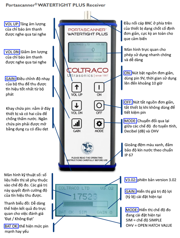 9. Ba chế độ đo: đo cường độ âm thanh (dB), đo tuyến tính/số (Linear) và đo giá trị độ mở của nắp hầm hàng (% OHV)